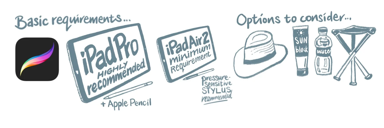Demonstrations, exercises and time to sketch on location are carefully integrated into the workshop so you can begin to master skills learned, ask questions, and get one-to-one guidance as you work. You will leave Zero to Hero with iPad+Procreate feeling much more confident about whipping your iPad out whenever inspiration strikes!
